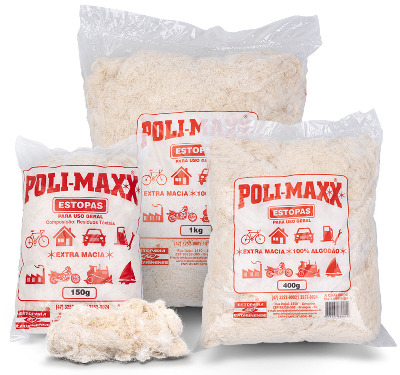 Disponível em fardos de 10 e 25 kg, e em pacotes de 150g e 1 kg. Essa estopa é utilizada para limpezas brutas e em geral, em oficinas mecânicas e vários segmentos industriais.